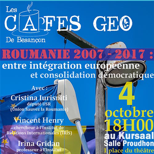 L'AGFC co-organise avec l'association Franche-Sylvanie et la Maison de l'Europe le prochain café-géo sur le thème "Roumanie 2007-2017 : entre intégration européenne et consolidation démocratique". Il se tiendra le 4 octobre 2017 au Kursaal, salle Proudhon. Une conférence aura lieu, suivie d'une dégustation et d'un débat.