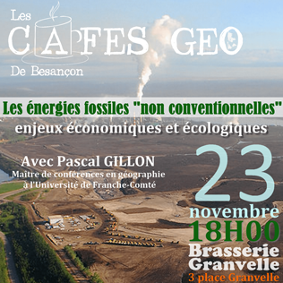 L'AGFC organise le prochain café-géo et fait intervenir Pascal Gillon, maître de conférences à l'Université de Franche-Comté, sur le thème des énergies fossiles "non conventionnelles" : enjeux économiques et écologiques. Il se tiendra le 23 novembre 2017 à 18h, à la Brasserie Granvelle (3 place Granvelle, 25000 Besançon). Entrée libre et gratuite.