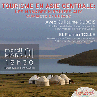 L'AGFC (Association des Géographes de Franche-Comté) organise un café géo le 1er mars à 18h30 à la Brasserie Granvelle, qui accueillera Florian Tolle, maître de conférences en géographie au laboratoire ThéMA et Guillaume Dubois, étudiant en Master 2 de Géographie et Aménagement pour une conférence sur le tourisme en Asie centrale.